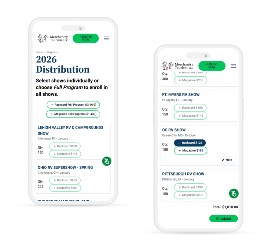 The development of the new Merchantry Tourism website delivered a radical upgrade to the customer experience, particularly with the introduction of its custom online show application and payment system. Previously, the process for signing up for key brochure distribution shows was cumbersome and manual, requiring customers to either print and complete a PDF order form or obtain a copy via mail or in-person pickup. Orders then had to be filled out by hand and submitted via mail with payment, or even by fax, creating a slow, fragmented process prone to delays and errors.