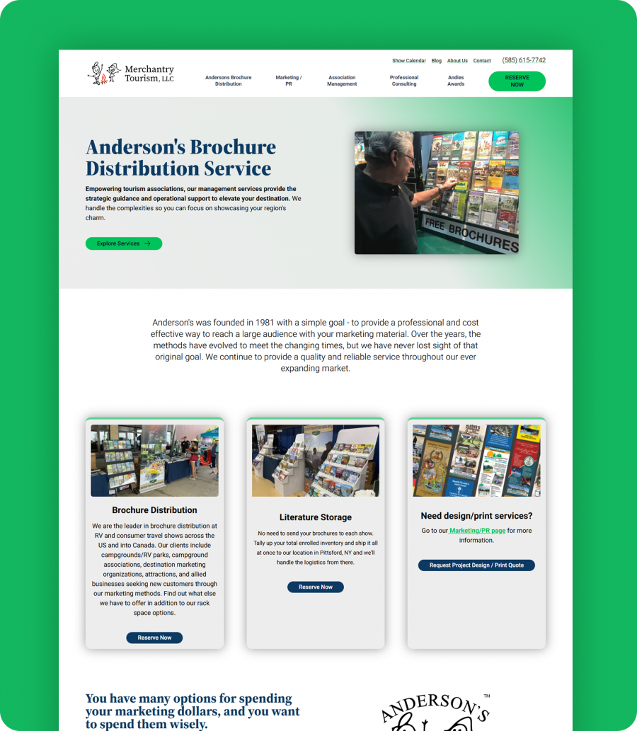 The project began with a core strategic initiative: to consolidate the well-established Anderson Brochure Distribution brand under the newly expanded identity of Merchantry Tourism, LLC. This move was designed to reflect a shift from a singular service provider to a comprehensive, multi-faceted boutique business. By integrating Anderson's legacy—which spans over 40 years as a leader in brochure distribution for the outdoor hospitality and travel industries—into the Merchantry Tourism brand, the company immediately broadened its market perception. The transition ensured that while the trusted brochure distribution service remained central, it was now strategically positioned alongside new offerings, including association management, marketing, and professional consulting, all operating under one cohesive Merchantry Tourism banner.